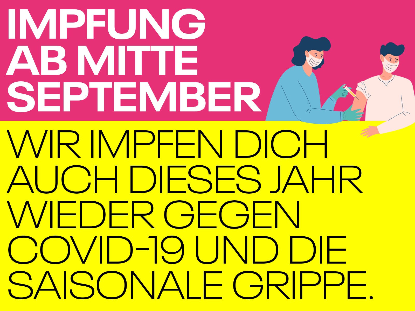 Ihr wunderschönen Menschen, auch in diesem Jahr werden wir euch selbstverständlich wieder gegen COVID-19 und die saisonale Grippe impfen.