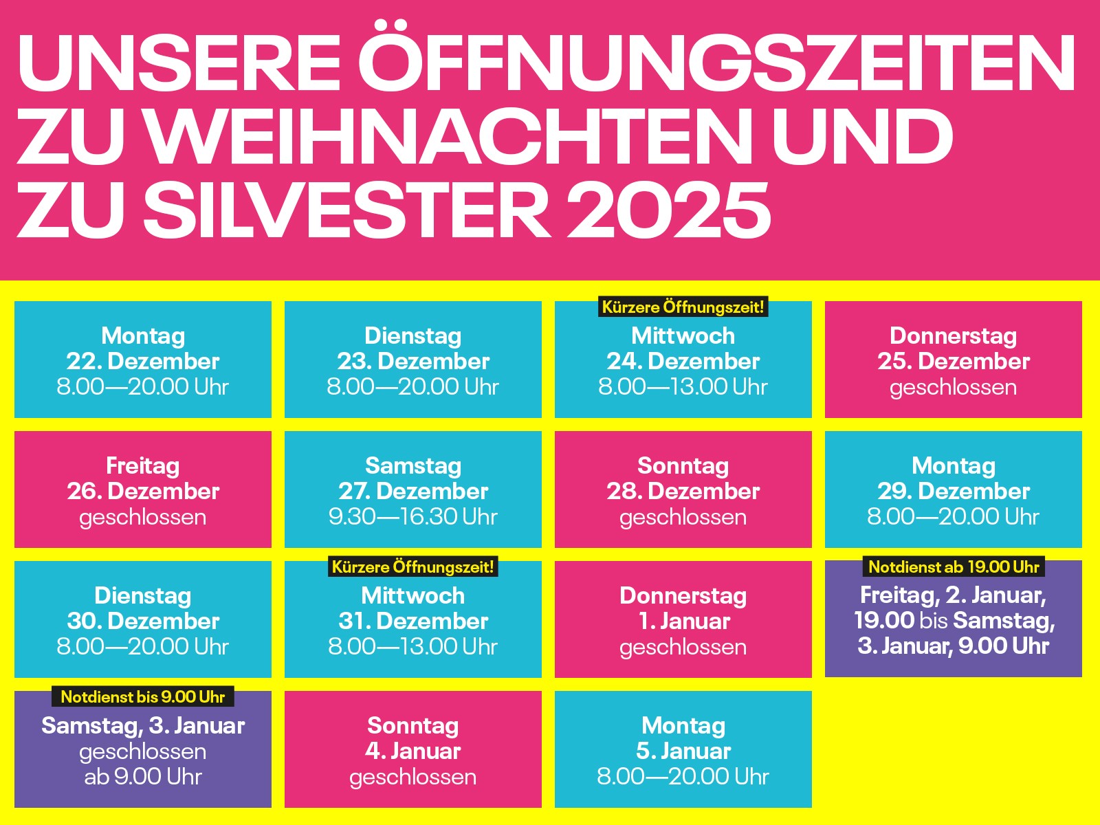 - Montag und Dienstag (22. und 23. Dezember) sind wir wie gewohnt von 8.00 bis 20.00 Uhr für euch da.