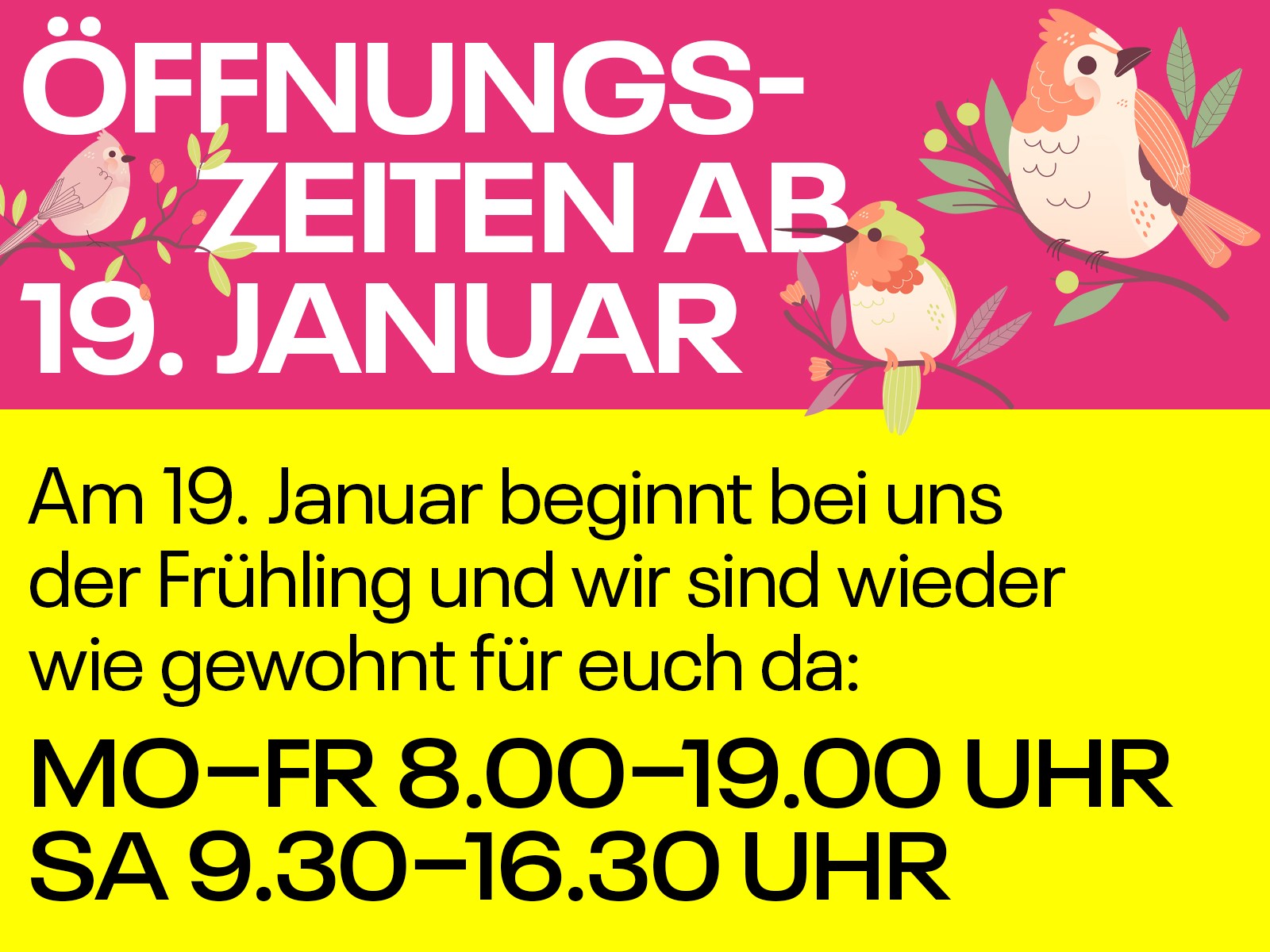 Ihr wunderschönen Menschen, ab 19. Januar sind wir in Frühlingslaune und unsere Öffnungszeiten ändern sich entsprechend:
