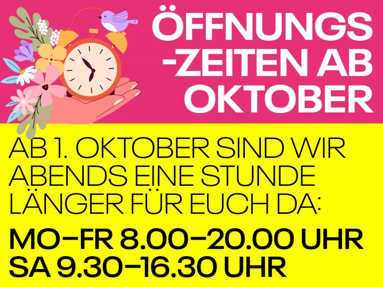 Ihr wunderschönen Menschen, ab 1. Oktober sind wir (wie jedes Jahr im Herbst und Winter) Montag bis Freitag abends eine Stunde länger für euch da: